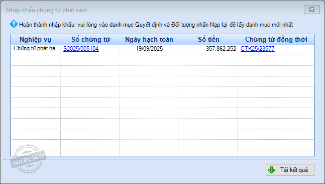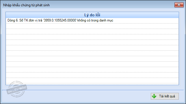 6. Trường hợp có bản ghi lỗi, chương trình sẽ không thực hiện nhập khẩu (kể cả bản ghi không lỗi). Nhấn Ok trên thông báo để xem lý do lỗi. Có thể nhấn Tải kết quả để tải và xem tệp bị lỗi.